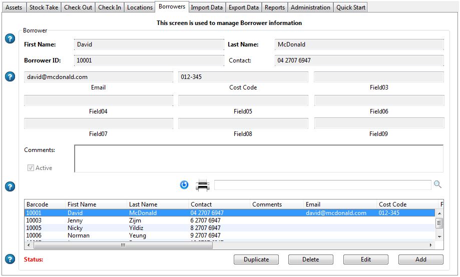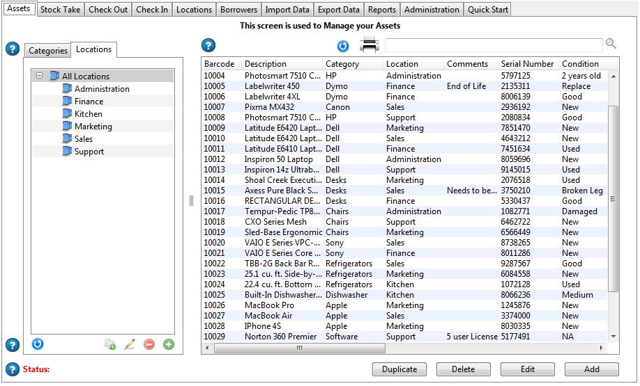 Get rid of that spreadsheet! My Assets is a complete solution for managing your organisation's Assets. Whether it is capital Assets, a corporate library or any other Assets you need to keep track of, the My Assets software is your answer. Features a powerful Stock Take module. Manages the lending Assets to your Borrowers complete with due dates.Import and Export capabilities allow you to transfer data back and forth between your existing software applications. A comprehensive reporting facility offers over 20 pre-defined reports. Also features an Unattended Mode where borrowers can simply scan their borrower barcode and then scan the items they are checking in or checking out. A simple powerful solution. Prints labels to the Dymo LabelWriter series of printers.